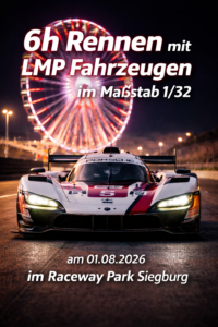 6h Rennen mit LMP-Fahrzeugen im Maßstab 1/32 am 1. August 2026 Veröffentlicht am 6. April 20266. April 2026 von Ralf Leenen Hier geht’s zu den Details Veröffentlicht in Uncategorized.